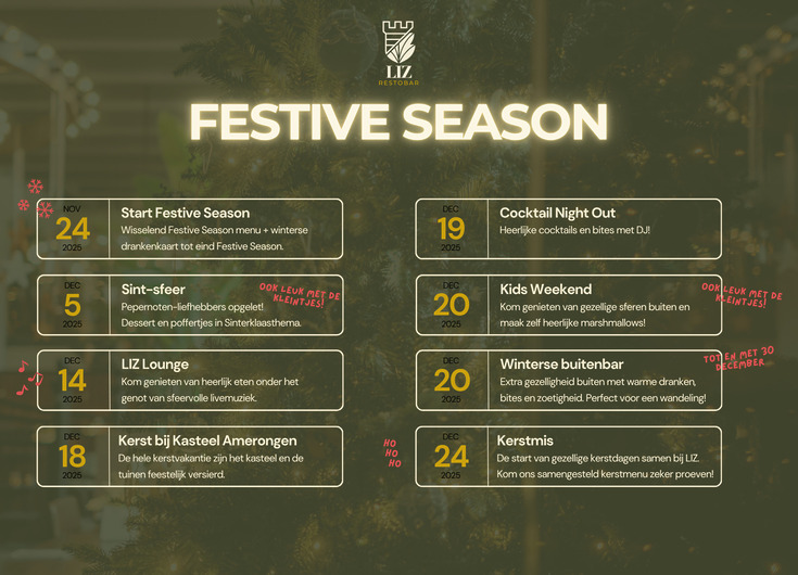 Bij LIZ begint op 24 november de meest sfeervolle tijd van het jaar: het Festive Season. Tot en met 4 januari vieren we de winter met warme gerechten, feestelijke specials en gezellige evenementen.